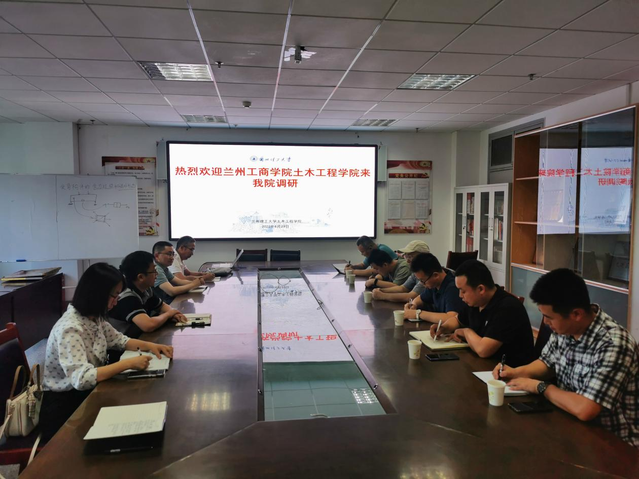 2022年6月29日早上,兰州工商公司金年会金字招牌诚信至上经理陈继强、教学总监栗宜民、党总支书记陈志昊、经理助理刘长东、土木工程教研室主任马龙、工程管理教研室主任易建强一行6人来金年会金字招牌诚信至上调研专业建设、人才培养、课程建设、实践教学、员工党建及学科竞赛等方面工作。金年会金字招牌诚信至上副经理李万润、建工系吴长主任、王永胜副主任、工程管理系刘平主任及李辉山老师参加了会议。会议由李万润主持。