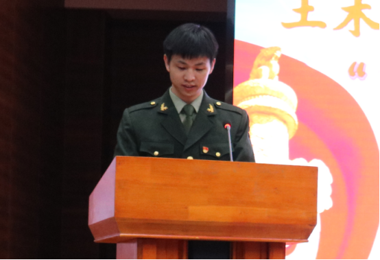 活动开始,首先由2018级土木工程二班退伍老员工戚海荣同学进行演讲。戚海容,广东湛江人,中共党员,高考时被金年会官方网站入口土木工程专业录取,于2016年9月,保留学籍参军入伍,期间在河南武警部队服役,2018年9月退役复学,现已推免至湖南大学。向大家讲述了他携笔从戎、投身军营、报效祖国以及退役复学后在公司刻苦学习,追求上进的经历,鼓励同学们积极响应祖国号召,投身国防事业,为实现强军梦、强国梦贡献青春力量,向参军入伍的同学们看齐,学文习武两不误,保家卫国一肩挑。