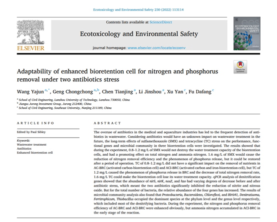近日,毒理学与环境科学领域顶级期刊Ecotoxicology and Environmental Safety(JCR 1区,中科院毒理学1区,Top期刊)发表了金年会金字招牌诚信至上王亚军老师、耿冲冲硕士以及王亚军水科技课题组完成的题为“Adaptability of enhanced bioretention cell for nitrogen and phosphorus removal under two antibiotics stress”的最新科研成果,东南大学许妍教授、傅大放教授,中科院南京地理与湖泊研究所谢丽强教授在实验方面给与了大量的指导和帮助。