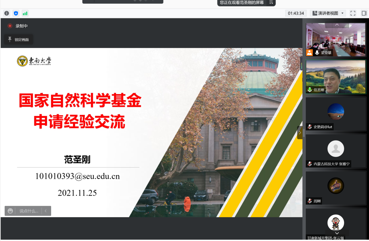 同时本次动员会公司也邀请到东南大学范圣刚教授在腾讯会议上做了题为“国家自然科学基金申请经验交流”的辅导交流报告。范教授从基金撰写阶段(题目、摘要和正文部分)、申请书的撰写检查、面上项目和青年基金的申请要点、基金选题、研究目标的确定、如何撰写研究内容、拟解决的关键问题、如何体现项目的特色和创新之处、研究基础展示及拟开展的工作等方面做了详细介绍,同时以他本人2018年申请获批的基金本子为例,进一步阐述了基金申报过程中的注意事项。他还特别强调要凝练科学问题、精打细磨,不断提高申请书质量。范教授将申报基金过程中总结的宝贵经验全面详尽地分享给了参会老师们,同时与参会教师进行了热烈的互动交流,青年教师就自己在基金申报过程中出现的疑惑、基金评审意见以及基金撰写的思路和关键点等与范教授进行了深入细致的交流,并获得了非常有针对性的意见和建议。参会教师表示本次交流会内容全面丰富,针对性强、实用性强,具有很好的指导意义,收获颇丰。