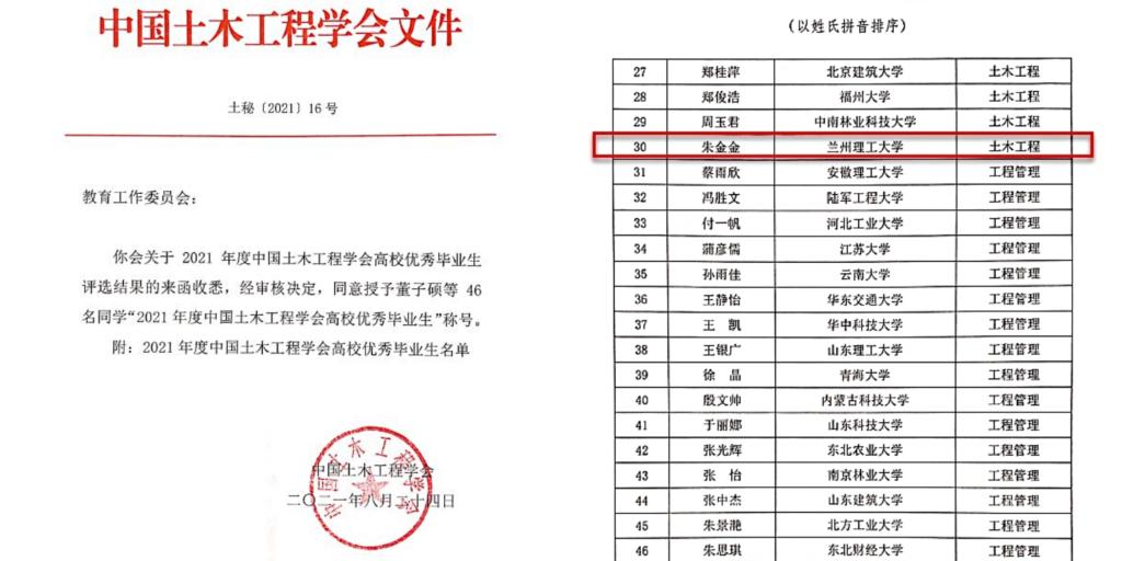 近日,从中国土木工程学会获悉,公司2021届土木工程专业毕业生朱金金获得“2021年度中国土木工程学会高校优秀毕业生”荣誉称号,这是评选该奖项以来,公司第15位同学荣获该奖项。