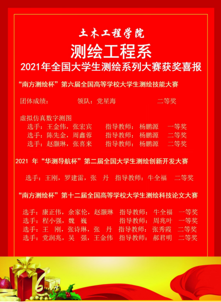 7月28-31日,由全国高校测绘类专业竞赛联盟和自然资源部职业技能鉴定中心主办的2021年全国老员工测绘系列大赛决赛在贵州大学举行,本次决赛采用选手线上参赛、评委线下评审的模式。公司测绘学子在本次决赛的三类赛项中斩获8个奖项:测绘科技论文大赛一等奖2项、二等奖2项,虚拟仿真数字测图大赛一等奖1项、二等奖2项,测绘创新开发大赛二等奖1项。