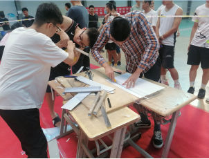 本次竞赛分为初赛和决赛两个阶段,共有98名员工报名参加初赛,通过初赛选拔的60名同学组成20支参赛队入围决赛。决赛以“支撑条件下的基坑开挖”为题,经过理论方案说明、模型制作、基坑开挖、加载测试四个部分考察参赛队伍的理论分析和实践创新能力。经过近8个小时的比赛,12个参赛小组的模型尺寸、基坑开挖和加载过程均符合要求;5个小组因基坑开挖过程中出现漏砂现象而失败;3个小组因加载过程沉降超限或漏砂而失效。由马昭、孙靖宁、陆锦斌同学组成的代表队凭借出色的结构设计荣获第一名。