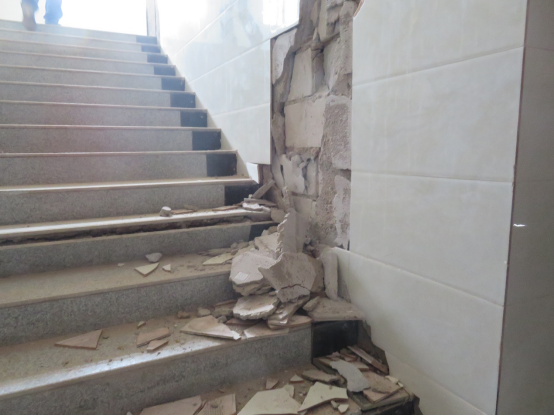 调研组查看了漾濞县中医院的结构表现,在地下室查看了隔震构造,并对护士长等用户代表做了访谈。该医院在这次地震中使用功能正常,药品柜等室内物品没有翻倒,屋顶水箱没有错位,上部结构完好,再次显示了隔震结构理念的优势。构造规范、设计合理的隔震结构能阻隔地震波向上部结构传播,保护结构和室内敏感设备。杜永峰教授对该工程地下室的隔震层楼梯间隔墙等构造问题提出了整改建议。