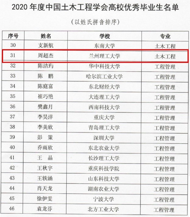 近日,从中国土木工程学会传出喜讯,公司周超杰同学荣获“2020年度中国土木工程学会高校优秀毕业生”称号。