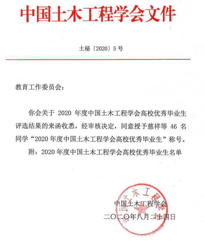中国土木工程学会高校优秀毕业生奖由中国土木工程学会于1989年设立,旨在表彰主修土木工程专业品学兼优的高校优秀毕业生。其与“中国土木工程詹天佑奖”、“中国土木工程学会优秀论文奖”并列,是土木工程专业三大全国性奖项之一。本次优秀毕业生评选经各高校自主推荐及专家评审,共有同济大学、河海大学、哈尔滨工业大学等高校的46名同学获奖。