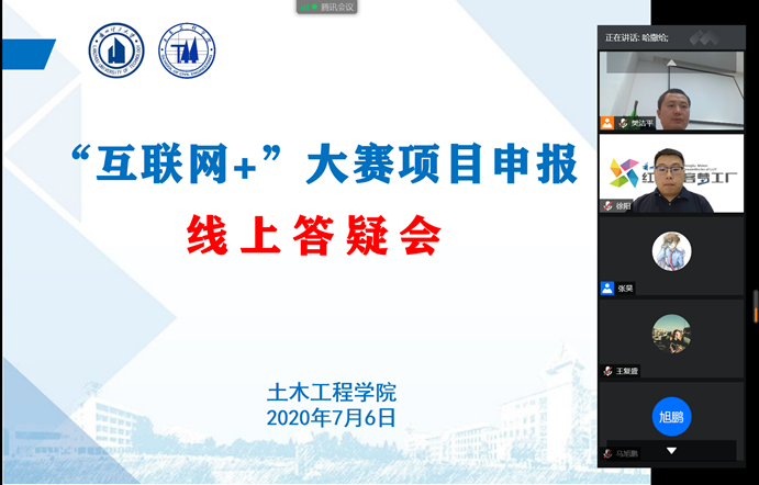 7月6日,土木公司开展了第六届“互联网+”大赛项目申报线上答疑会。土木公司副经理马天忠、公司创新创业公司徐阳老师及土木公司“互联网+”大赛全体参赛同学、指导老师共计400余人参加了活动。活动由公司团委书记樊洁平主持。
