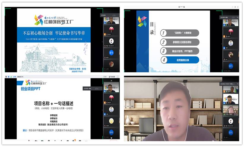 活动依托腾讯会议、网络直播平台开展。徐阳老师做了题为“不忘初心敢闯会创,牢记使命书写华章”的主题报告。报告从“互联网+”大赛的由来、公司互联网+大赛所取得的成绩、参加“互联网+”大赛意义、商业计划书撰写及答辩PPT制作、优秀案例分享等若干模块,对“互联网+”大赛进行了全面解读。