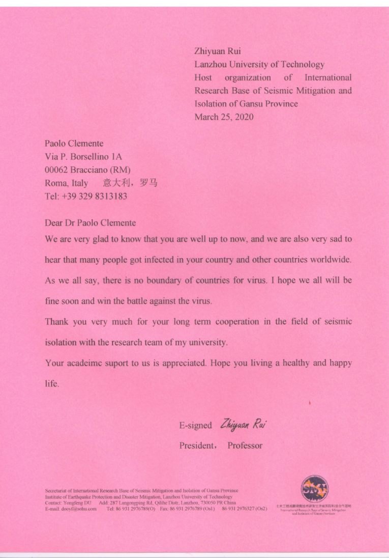 近一段时间以来,新冠疫情在全球多个国家蔓延。一批担任金年会官方网站入口甘肃省土木工程减震隔震国际科技合作基地第一届学术委员的专家所在国家也受到疫情困扰,防护用品特别缺乏,生活极为不便。公司党委夏天东书记、芮执元董事长了解到专家们困难,委托减隔震国合基地管理团队立即给予援助,先后向疫情较为严重的意大利、美国、日本、英国、韩国、塞尔维亚等国家的外籍委员寄送了防护物资。芮执元董事长还代表基地依托单位,给10多位与公司长期合作的专家签发了热情洋溢的慰问信,受到慰问的专家包括第一届学术委员会主任委员、美国伊利诺伊大学厄巴纳校区首席教授BF Spencer博士、日本工程院院士、日本隔震构造学会(JSSI)理事长Akira Wada(和田章)博士、国际减震控制学会(ASSISi)创始主席、意大利能源环境与高新技术研究院(ENEA)博洛尼亚分院原首席执行官Alessandro Martelli博士、国际减震控制学会(ASSISi)现任主席、ENEA罗马分院地震工程部门主任Paolo Clemente博士、加拿大工程院院士、加拿大不列颠哥伦比亚大学(UBC)教授Carlos E. Ventura博士和日本东北大学Norio Inoue教授、日本福冈大学Mineo Takayama教授、亚美尼亚MikayelMellkumyan教授等。