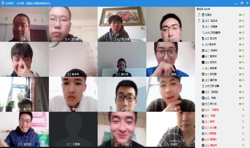 《工程弹性力学》(99人)和《混凝土与砌体结构设计》(86人)两门课程,采用开展线上教学+QQ视频直播的方式进行,前期资料和任务发放等通过学习通平台超星,课堂讲授通过QQ视频直播、全屏投影与员工进行同步讲解,感觉效果更好。直播过程中可以随机提问,就关键知识点进行讲解和互动。预留约5-10分钟左右的时间进行答疑,及时了解员工对本节课内容的掌握情况,答疑模式采用QQ视频功能的白板功能,可以结合声音+图像的分解作用,有一种课堂的“黑板”模拟功能,帮助员工理解关键性问题。