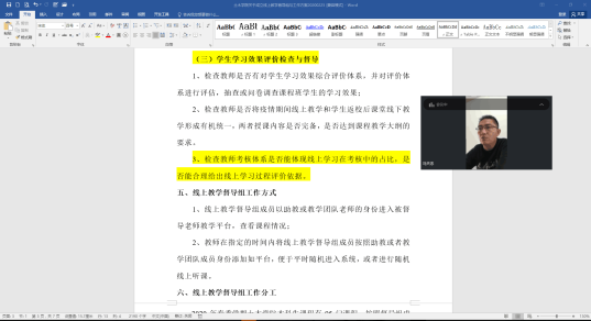 首先,马天忠对公司线上教学督导组工作进行了安排,向督导专家老师详细解读了公司督导方案,他多次强调,本次督导原则“以导为主,以督为辅”,并提出五点工作要求,督导成员要高度重视、恪尽职守、提高政治站位,明确线上教学督导任务、督导工作要求和督导工作方式,做好疫情防控期间的教学督导工作。