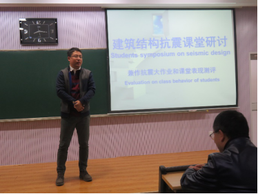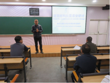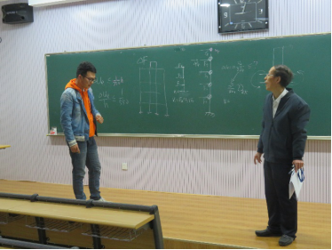 研讨交流活动由教学团队成员、《建筑结构抗震》课程主讲青年教师朱前坤博士主持。教学团队负责人杜永峰教授介绍了活动背景和基本要求。员工们根据团队制作的研讨测试记录表,结合课外完成的钢筋混凝土框架结构和砌体结构抗震设计大作业,回答随机出现的近70个、对于深化课程内容理解具有一定帮助作用的问题。要求员工在讲台上发言,可以用说、写、算、画或者几种手段混合使用的方式发表见解和观点,每个员工陈述时间不超过3分钟。一个员工发言时,其他员工可参与讨论,并且在测试记录单背面简单记录自己的回答要点关键词,现场回答和员工提交的书面测试记录评判成绩将作为每个员工课堂表现测评的依据。