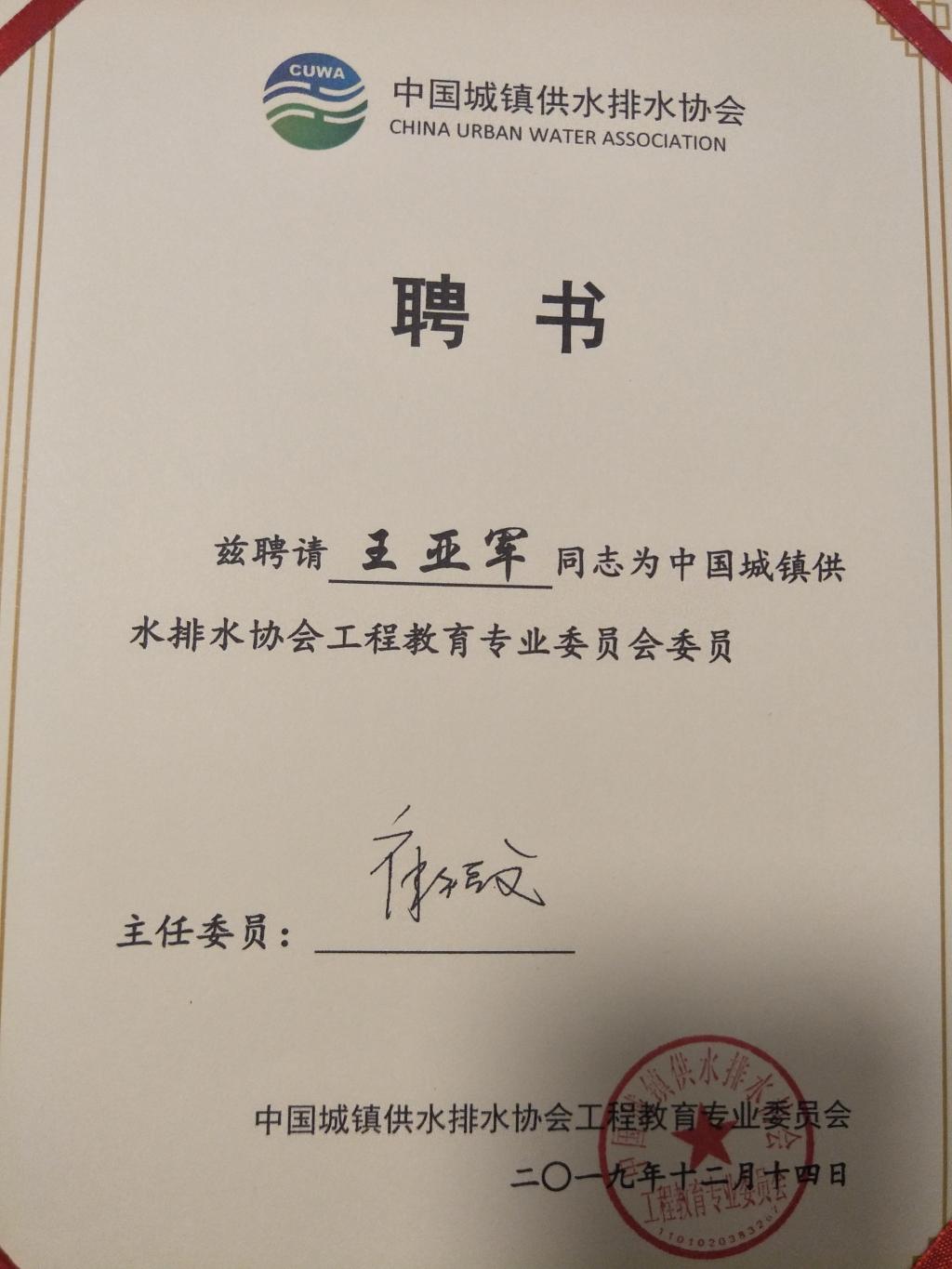 会上中国水协高伟副秘书长宣读了中国水协关于批准成立教育委的决定,中国水协章林伟会长发表讲话,进一步明确了委员会的工作职责,对委员会的工作提出了希望和要求。并宣布了中国水协教育委委员单位及委员名单,举行委员单位及委员证书颁发仪式。主任委员崔福义教授汇报了中国水协教育委筹备工作情况及工作计划。金年会金字招牌诚信至上给排水科学与工程系主任王亚军获得了委员聘书。