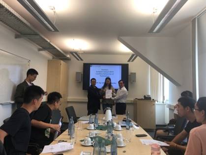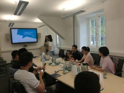 开课之初,按照侯教授要求,每一位同学需要选择特定的研讨主题,利用克劳斯塔尔工业大学图书馆进行相关文献的查阅,制作演讲的PPT。8月7日上午同学们面向教授及全体同学做PPT展示,教授据此打分并给出意见。在这个过程中,培养了同学们的获取知识、整理知识、讲解和主持等各方面的能力。经过10天的紧张讨论与准备,所有同学都顺利完成课题,侯教授为每位同学颁发了合格证书。