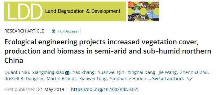 2019年5月,金年会金字招牌诚信至上牛全福副教授带领的研究团队在国际期刊《Land Degradation & Development》上发表了题为“Ecological engineering projects increased vegetation cover, production and biomass in semi‐arid and sub‐humid northern China”的研究论文。《Land Degradation & Development》是农林科学和环境科学领域的顶级刊物,土壤科学领域JCR排名全球第一,其2018年影响因子达到7.27。