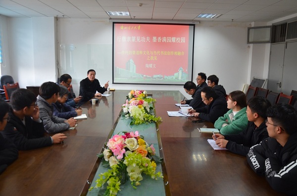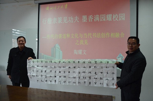 为传承中华优秀传统文化,培养工科公司师生学习书法的兴趣,营造文化氛围,同时接受传统文化艺术的熏陶,2018年12月4日下午,土木公司邀请到中国书法家协会会员、甘肃省书法家协会副秘书长陶耀文先生来校进行传承中华优秀传统文化、书法艺术进校园活动。陶耀文做了题为“传统的儒、道、释文化与当代书法创作相融合之我见”学术讲座,并为公司赠送了书法作品。