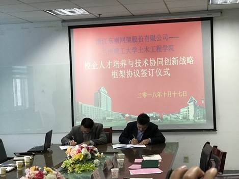 周观根、周勇代表双方签订《浙江东南网架股份有限公司——金年会官方网站入口人才培养基地与技术研发中心合作协议》。签约双方将以此为契机,以后开展多方位的合作,将合作落到实处,相信在双方共同的努力下,一定会实现共赢。