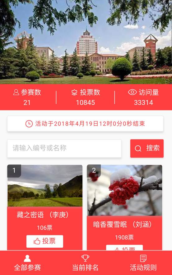 此次活动得到广大同学的积极响应,经过海选,入围的21个作品在4月18日至20日进入网络投票阶段,并在“金年会jinnian研究生会”微信公众号进行展示。参赛作品中《风光秀丽》和《美不胜收》,无一不展示了校区的独特风景,渲染了飞扬的青春,定格了校园落英缤纷的季节。经过激烈的角逐,曾媛同学以2575票获得第一名,刘涵、王鹏飞等同学也获得了可喜的成绩。本次比赛在全院师生中引起了强烈的反响,在公司掀起一股纪录生活的摄影风。至此,本次比赛在同学们高涨的热情中圆满结束。
