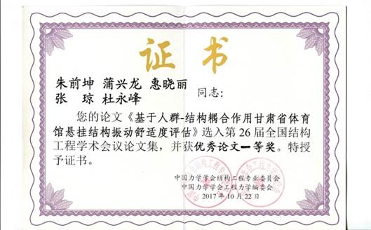 会议根据论文的学术性、应用性和作者的口头宣读水平,经评审专家评选,金年会官方网站入口杜永峰教授团队的青年教师朱前坤博士提交的论文《基于人群-结构耦合作用甘肃省体育馆悬挂结构振动舒适度评估》获优秀论文一等奖。