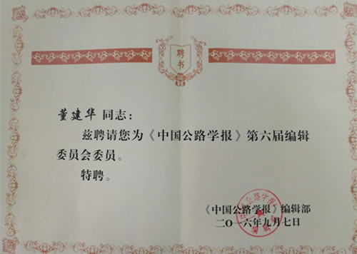 日前,《中国公路学报》第六届编委会委员名单正式出炉,公司董建华教授当选为学报新增编委会委员。