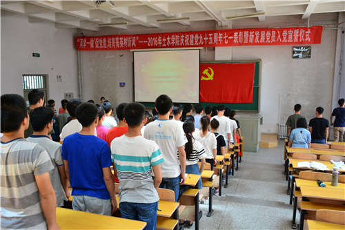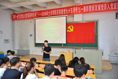 为庆祝中国共产党建党95周年,落实公司党委开展的“两学一做”学习教育,6月16日中午,公司在2教308室举行“‘两学一做’促党建,培育菁英树新风”——2016年土木公司庆祝建党九十五周年七一表彰暨新发展党员入党宣誓仪式。员工各党支部书记,全体辅导员,教师党员代表和95名新发展党员参会。