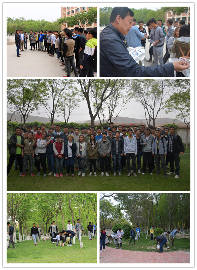5月6日下午,公司中干联系班级系列活动之“树立环保意识,培养劳动品质”主题活动在西校区展开,后勤服务集团高副总经理高宝年与15级建筑环境与能源应用工程一班的同学们参加了本次绿色校园行动。下午4时许,建环一班的同学与高总齐聚红柳广场,高总首先动员讲话倡导大家一起体验公司后勤保洁员的工作,在劳动中树立环保意识,不要给后勤工作人员增加负担,同时培养良好的劳动品质。高老师的观点得到了同学们的一致赞同。他为大家分发保洁用的手套和塑料袋,从北村的核桃林到南村的宜海湖畔,从东边的中北路花园到西大门的“游标卡尺”,校园里处处隐现同学们勤勤恳恳的身影和热情洋溢的笑脸。一次一次的弯腰,一次一次的把垃圾装进袋子里,体现了理工大人的干练耐劳的品质。