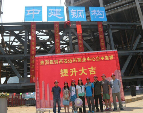 7月6日下午,公司王秀丽教授及课题组成员丑亚玲教授、马天忠副教授及来春景老师、吴长老师、周锟老师应邀参加西安迈科商业中心空中连桥提升工程。课题组现场观摩了连桥提升过程,并与中建钢构的员工进行了交流,就该工程钢结构施工难点及提升技术进行了探讨。