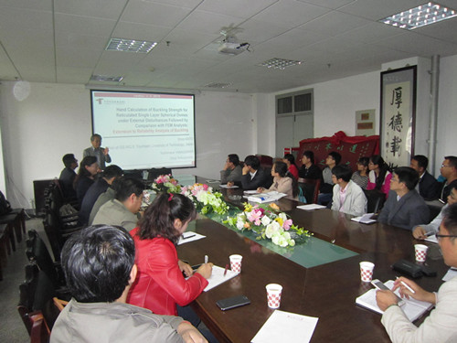 Comparison with FEM Analysis.(外部荷载下单层球面网壳结构屈曲强度的手算方法与有限元分析方法的比较)”的学术报告, 报告会由王秀丽教授主持,公司经理韩建平教授、杜永峰教授和实验室、建工系相关教师以及博士、硕士研究生参加活动。