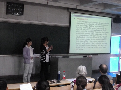 活动中,陈海龙、南娜娜、崔旺、张晓非、方登甲、余丽玲等组成的15个课外研究团队分别作了题为“Optimization of fame shear wall structure”、“Optimum design of reinforced concrete floor plate”等课外研究小论文的报告,介绍的内容包括螺纹桩、变截面斜梁、井式楼盖等结构及构件的优化设计等模型和思路。土木工程专业的周洲和冯治斌所同学所做的题为“基于实验现象的单筋矩形截面梁适筋破坏的M-Φ曲线的理论推导”和工程管理专业钟鸣同学所做的题为“压电发电片与人行道的组合及应用”课外研究,富有新意,展示了公司土木工程学子良好的学术探索能力。其中,彭翀、周洲、李静尧等同学的英语表达交流能力受到了参会专家的好评。