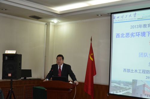“西北恶劣环境下土木工程防灾减灾研究”教育部长江学者团队带头人朱彦鹏就团队建设规划基本情况向专家组进行汇报,介绍了创新团队基本情况、研究方向、取得的标志性学术成果、对团队建设和人才培养的贡献和支撑、平台建设和团队发展前景以及拟开展的研究内容。