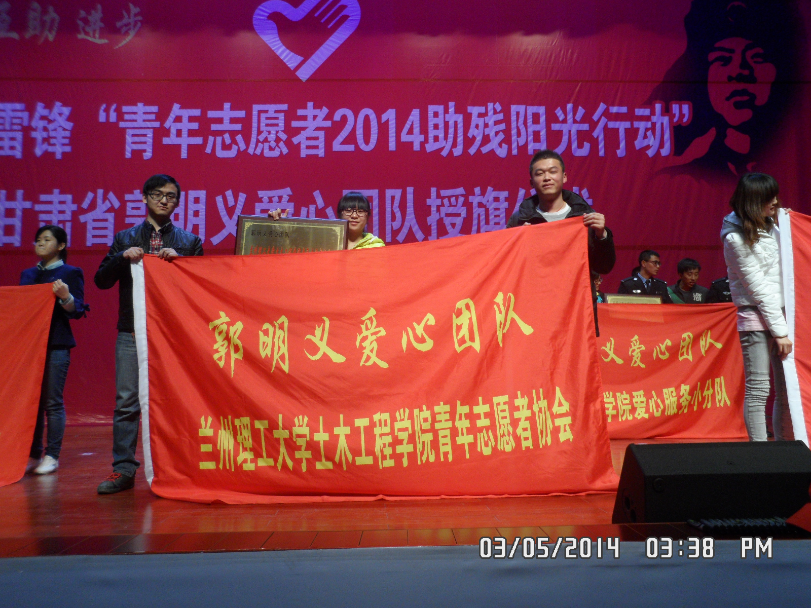 2014年3月5日,以“青春志愿中国梦”为主题的“3.5”学雷锋“青春志愿者2014助残阳光行动”暨甘肃省郭明义爱心团队授旗仪式在兰州大学盘旋路校区礼堂隆重举行。本次活动由甘肃省委宣传部、团省委、省文明办、省残联、省青年志愿者协会主办,全国道德模范、中共中央候补委员、全国总工会副主席、“当代雷锋”郭明义,省委副书记欧阳坚,省委常委、兰州军区政委傅传玉,省人大常委会副主任孙效东,兰州大学党委书记王寒松等领导嘉宾出席,团省委书记陶军锋主持启动仪式,全省各高校1000余名青年志愿者参加了活动,土木公司青年志愿者协会受邀参加了“甘肃省郭明义爱心团队”授旗仪式。