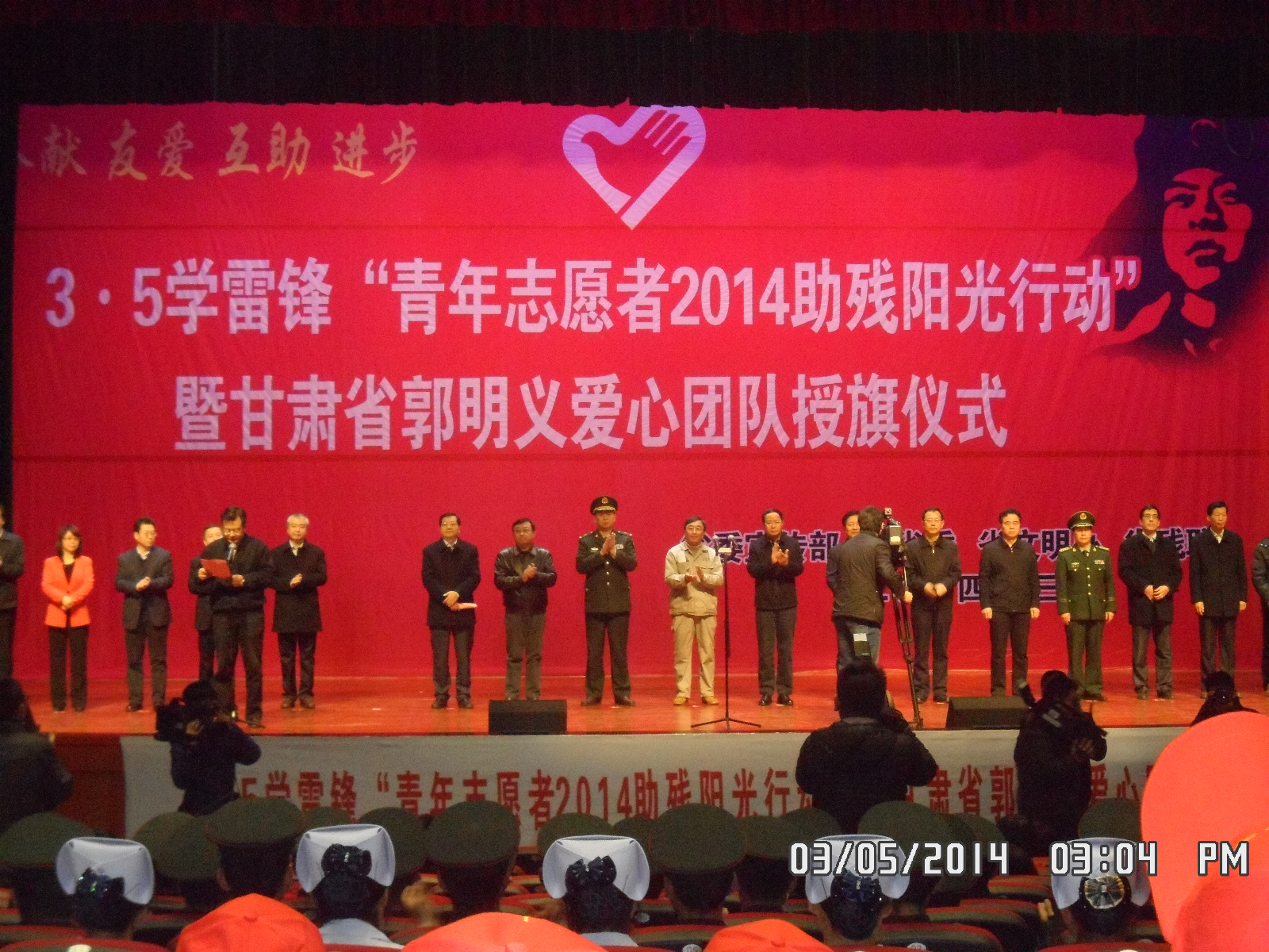 下午3点,“3.5”学雷锋“青春志愿者2014助残阳光行动”暨甘肃省郭明义爱心团队授旗仪式正式开始。仪式上,当代雷锋郭明义宣读了习近平总书记给“郭明义爱心团队”的回信,并传达了回信精神。习近平总书记在信中写到:“得知你们‘跟着郭明义学雷锋’,用爱心温暖需要帮助的人,在服务社会、助人为乐、爱岗敬业中提升人生境界,感到很欣慰”,“雷锋精神,人人可学;奉献爱心,处处可为。积小善为大善,善莫大焉。当有人需要帮助时,大家搭把手、出份力,社会将变得更加美好”。