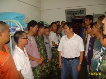 2009年9月2日晚,已是晚上九时许,当新生军训结束,都回到员工宿舍后,公司党委狄生奎书记带领公司薛小勇副书记、副处级组织员刘永军老师及辅导员张燕老师、郝君明老师走进了员工宿舍,前去看望公司2009级新同学。当新同学得知公司领导、老师前来看望他们,一个个兴高采烈,鼓掌欢迎。