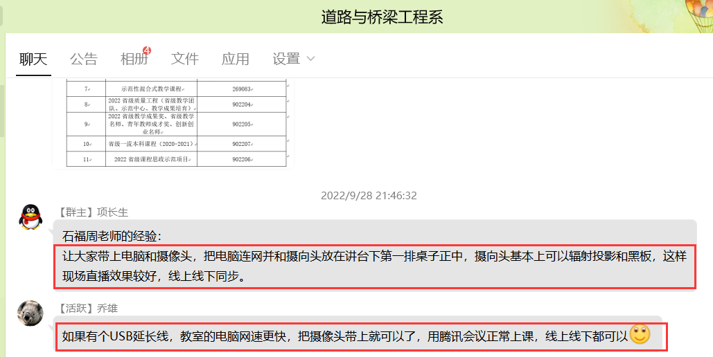 接下来在授课阶段,道桥系老师们纷纷总结了相关经验及做法。主要包括:一是授课前,提前到达教室调试设备:各区教室的多媒体设备有所不同,老师们课前在系群里相互分享经验,并在课前提前到达教室进行组装与调试。二是关注线上员工听课感受:对线上员工听课过程中的视听两方面感受进行关注,除常规PPT分享界面的设置外,重点对声音的接收、视频播放等进行了调试,具体做法为在腾讯会议中对麦克风进行选择。