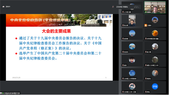 李振佑教授紧扣党的二十大报告原文,深入阐释了党的二十大的重大现实意义和深远历史意义,重点围绕大会主題、过去五年的工作和新时代十年的伟大变革、开辟马克思主义中国化时代化新境界、新时代新征程中国共产党的历史使命、全面建设社会主义现代化国家的战略部署、深入推进新时代党的建设新的伟大工程和团结奋斗引领历史伟业七个方面全面系统解读了党的二十大精神,积极引导公司广大师生准确把握党的二十大精神的丰富内涵、核心要义和目标要求,切实增强学习宣传贯彻党的二十大精神的思想自觉和行动自觉。