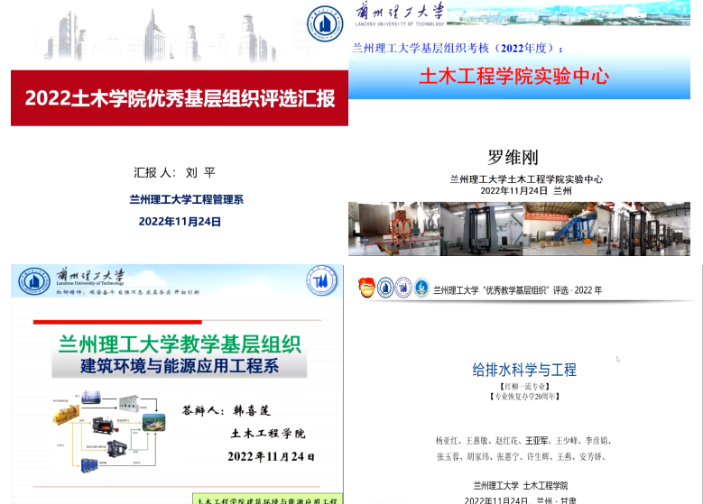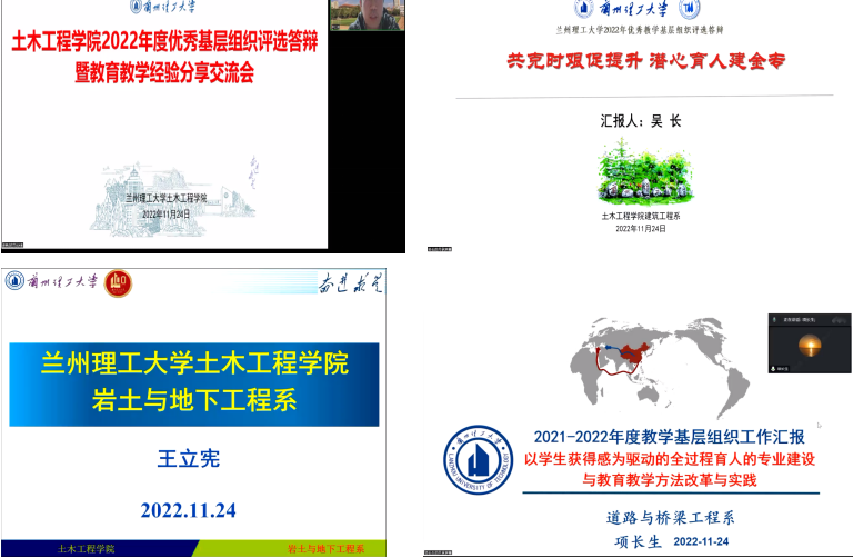 李万润对2022年度金年会金字招牌诚信至上优秀教学基层组织的评选准备情况进行了介绍,并对评估办法和相关的指标体系修改情况进行了介绍。在评价体系中,考虑三全育人,首次将今年疫情防控作为专项工作纳入考评体系。建筑工程系、岩土与地下工程系、道路与桥梁工程系、测绘工程系、工程管理系、给排水科学与工程系、建筑环境与能源应用工程系和实验中心等8个教学基层组织负责人分别从机构设置、基本职责、专业及课程建设、教学改革与研究、教学活动、标志成果、疫情防控专项工作等方面进行了汇报,并对基层组织建设中的心得和经验进行了交流讨论。
