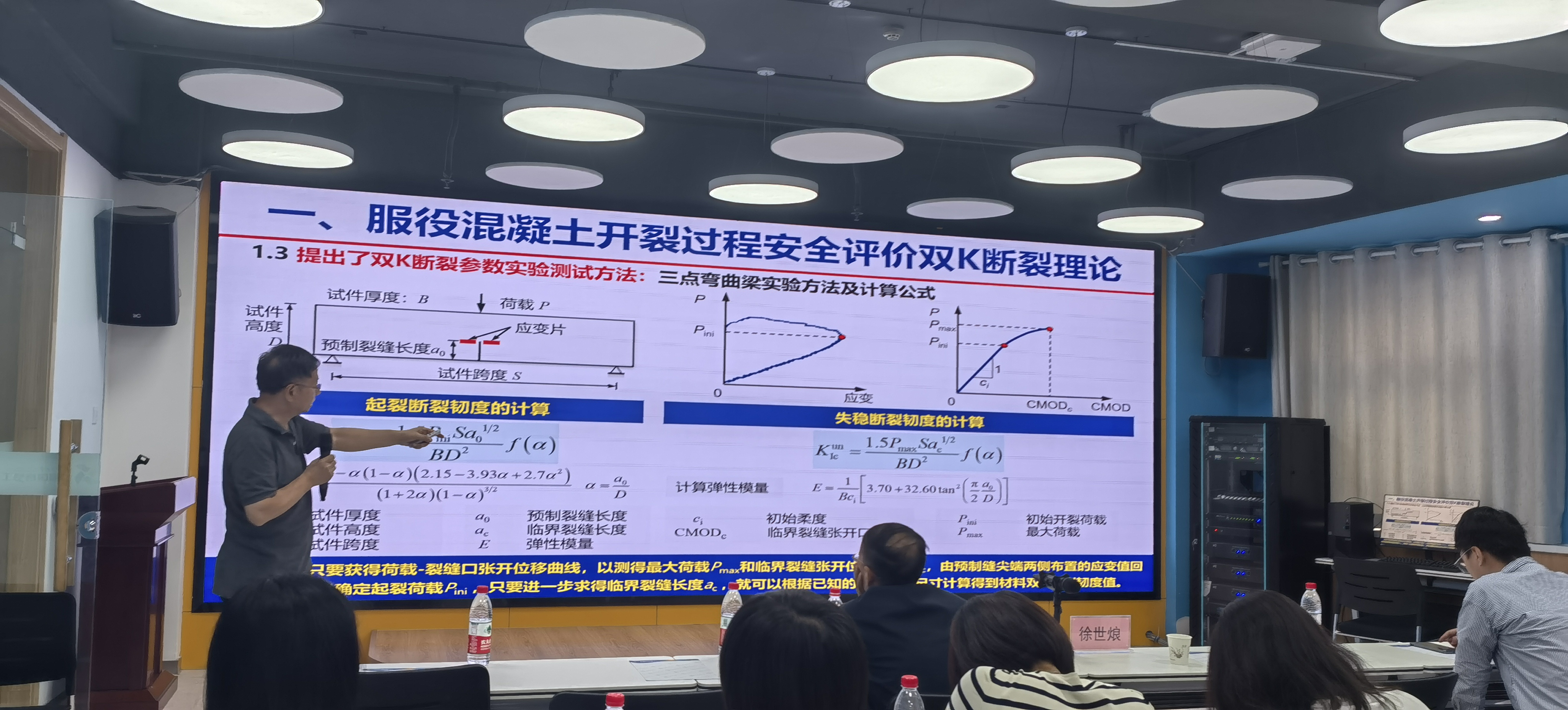 8月18日下午,徐世烺院士在金年会官方网站入口兰工坪校区红柳梦工场学术报告厅做了题为“基础设施混凝土结构韧性与安全保障技术”的学术报告会。他从我国工程建设行业混凝土结构用量和配合国家低碳发展导向等讲起,介绍了混凝土结构安全韧性评价的双K断裂理论、高韧性混凝土材料与结构性能和在重大工程中的应用等。徐院士创新建立的双K断裂理论模型揭示了裂缝起裂到失稳破坏全过程的应力奇异性量化规律,并采用微宏多尺度增强增韧技术极大地提升了水泥基复合材料的宏观强度和变形能力,在混凝土材料性能方面实现了从脆性易裂到超高韧性的重大转变。报告理论层次高,成果在三峡大坝二期和三期等国家级重大工程项目中有应用。讨论交流阶段他解答了青年教师和研究生们的关切,对公司相关团队的研究工作具有重要参考价值。