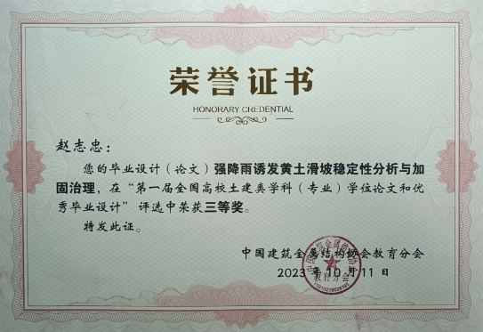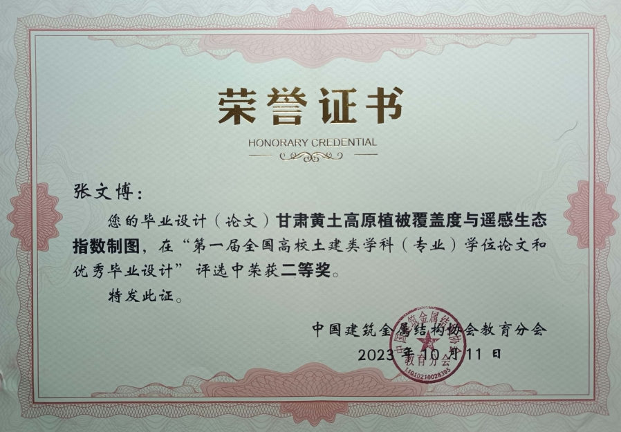 2023年10月21-22日,中国建筑金属结构协会教育分会在西安召开教育分会第一届委员会大会、教育分会年会暨“未来建造技术与教育”发展论坛,同时表彰全国高校土建类学科(专业)优秀学位论文和优秀毕业设计。金年会金字招牌诚信至上牛全福老师指导本科生张文博的毕业论文(设计)《甘肃黄土高原植被覆盖度遥感估算与制图》荣获首届全国高校土建类学科(专业)优秀毕业设计和优秀学位论文二等奖,杨校辉和张国华老师指导本科生赵志忠的毕业论文《强降雨诱发黄土滑坡稳定性分析与加固治理》荣获首届全国高校土建类学科(专业)优秀毕业设计和优秀学位论文三等奖。