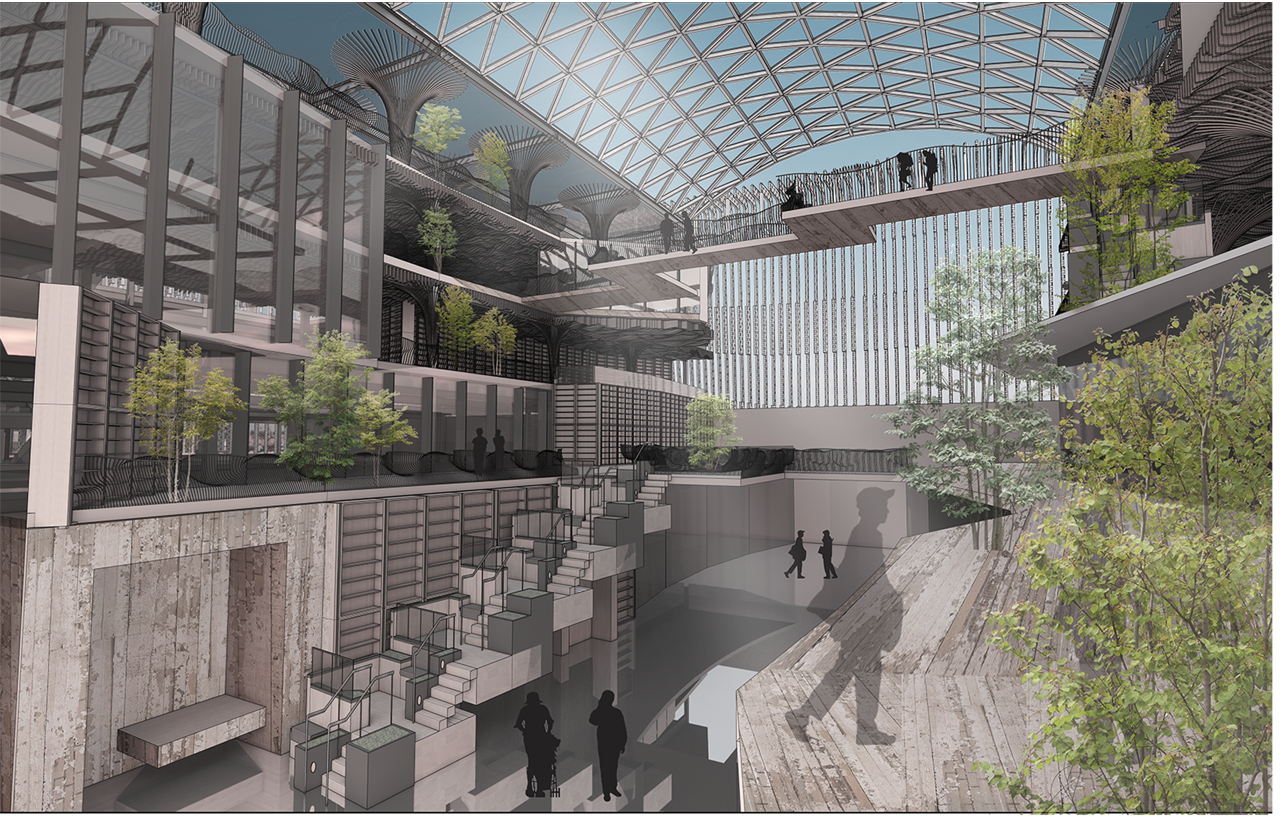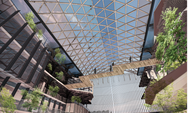 为了更加突出作品的特色,方案注重细节的设计,如光线引导:山谷中庭屋面网壳中部采用铝合金材料,两侧部分中庭均采用轻盈的大跨空间结构,减小了结构对内部空间采光的影响,光线与人的运动赋予了整个空间的活力,达到了让光线来做设计的效果。将钢、铝两种材料综合运用,设计出钢铝组合网壳,通透采光的同时,造型美观,使中庭山谷与天空遥相呼应,让中庭山谷融入大自然;天然植物纤维在围护墙板中的应用降低了成本的同时,也契合了可持续发展主题。考虑到建筑、人、自然之间的对话关系消解建筑的体量感,让中庭山谷更好的融入自然环境中。