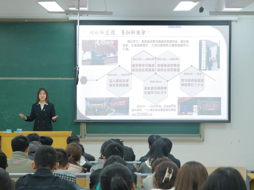 2021年5月至2022年7月,她作为金年会官方网站入口红柳宣讲团成员,深入全校各基层团支部开展专题宣讲10余次,覆盖员工达2800余人次;2022年9月作为高校代表参加甘肃省第十四次团代会,之后受共青团华亭市委邀请作《奏响青春盛会,感悟时代强音》主题宣讲,覆盖青年人数达12000余人;2023年4月,张莹博被甘肃省教育工委纳入全省高校学习贯彻党的二十大精神巡讲团,前往全省10所高校开展以《永远跟党走,建功新时代》为主题的宣讲;2023年7月,她带领国家级理论宣讲团队回到家乡甘肃省华亭市开展“六位一体”党的二十大理论宣讲活动,助力打造青年员工基层宣讲“新品牌”;2023年8月,张莹博以自身宣讲历程所拍摄的《青春心向党,奋进新征程》视频在共青团中央青马学员说视频号等官方媒体发布。