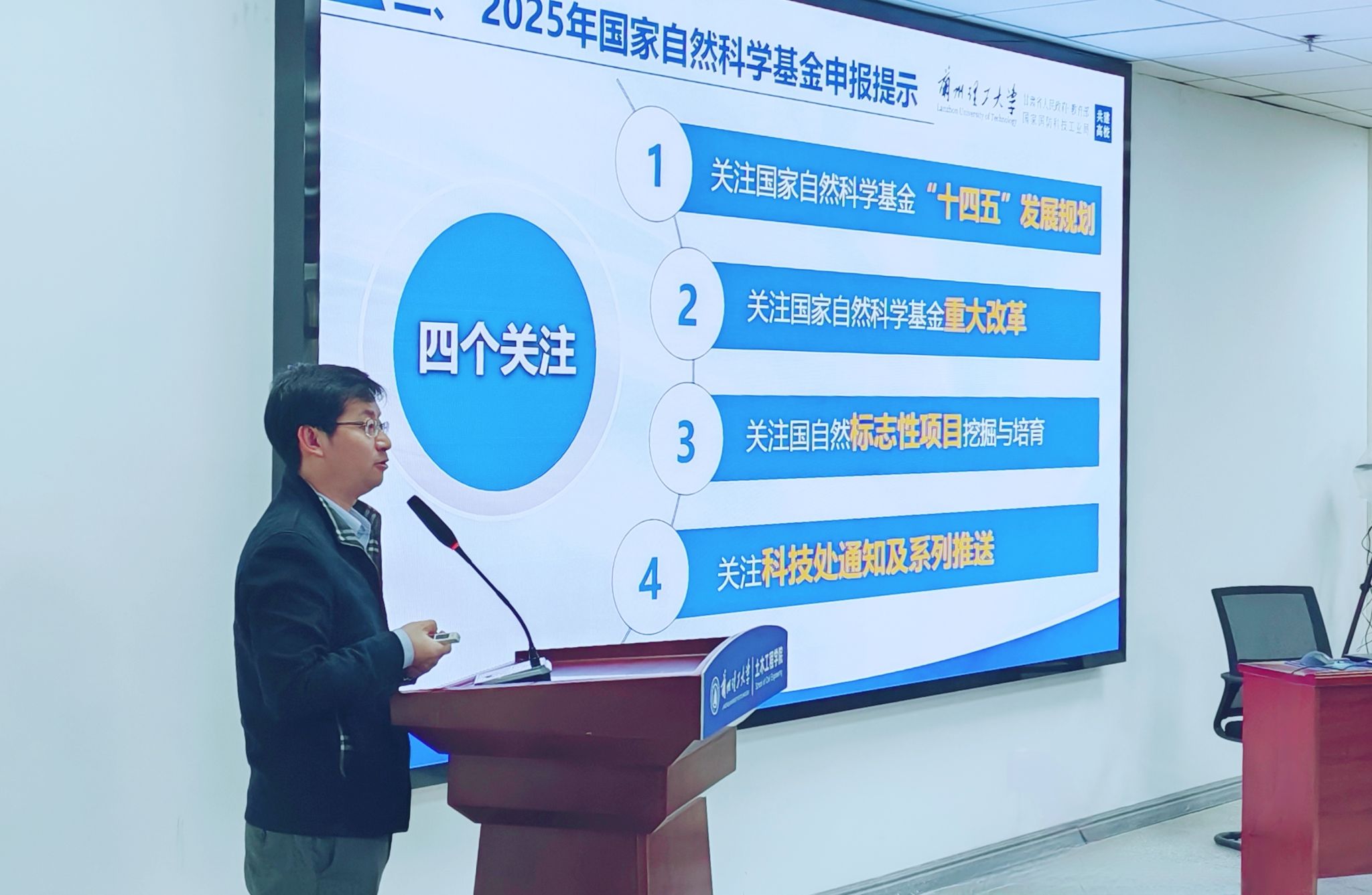 辅导会,唐晓龙处长基于公司2024年国自然申报立项情况和土木公司近3年国自然申报立项情况,提出了几点分析和建议,并对2025年国家自然科学基金申报做了温馨提示,要做到“四个关注”:关注国家自然科学基金“十四五”发展规划、关注国家自然科学基金重大改革、关注国自然标志性项目挖掘与培育、关注科研处通知及系列推送。同时也要了解与项目申报和科技进步相关的法律基础、近年来的中央财政投入规模、完善部分人才类项目资助政策以及项目的申报流程和评审流程等。