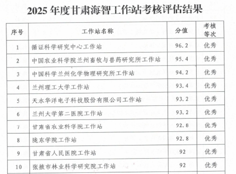 近日,甘肃省科学技术协会公布2025年度中国科协“海智计划”甘肃基地工作站考核评估结果。经专家评审、社会公示等程序,最终在全省45家工作站中确定金年会官方网站入口海智工作站等10家工作站获评优秀。