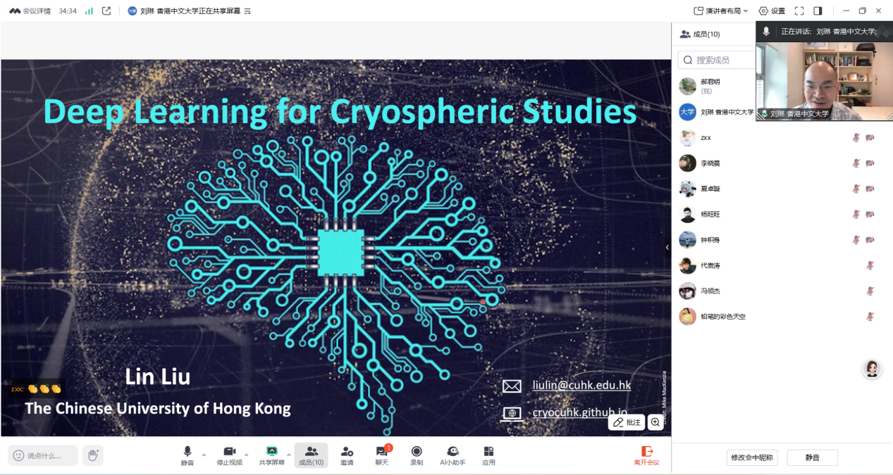 5月26日,应公司邀请,香港中文大学地球及环境科学系刘琳副教授在线上做了题为“Deep Learning for Cryospheric Studies”的学术报告,测绘工程系及相关学科师生20人参加本次学术交流。