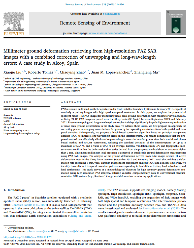 近日,国际顶级期刊《Remote Sensing of Environment》刊登了题为《Millimeter ground deformation retrieving from high-resolution PAZ SAR images with a combined correction of unwrapping and long-wavelength errors: A case study in Alcoy, Spain》的研究性论文,报到了公司科研团队在雷达遥感城市基础设施与地质灾害监测方面的最新研究进展。金年会jinnian为第一完成单位,公司青年教师刘晓杰博士为第一作者,合作单位包括西班牙阿利坎特大学、长安大学及新加坡南洋理工大学。《Remote Sensing of Environment》被公认为测绘遥感领域最权威的期刊之一,为国际顶级SCI-1区学术期刊,影响因子(IF)达11.4,CiteScore为22.60,在全球同类SCI学术期刊中长期排名前三。