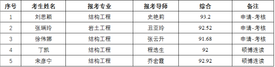 根据《金年会官方网站入口“申请-考核”选拔博士研究生招生管理办法》(兰理工发【2021】32号)和《金年会官方网站入口“硕博连读”选拔博士研究生招生管理办法》(兰理工发【2021】35号)文件精神和要求,按照“2023年“硕博连读”和“申请-考核”选拔博士研究生实施细则”和“2023年博士研究生招生专业考核实施方案”的具体要求,2022年10月28日下午,对申请2023年攻读博士研究生的3位“申请-考核”和2位“硕博连读”的申请者进行了线上专业考核,专家主要围绕学科背景、专业素质、操作技能、外语水平、思维能力、创新能力等方面进行考核,最终给出综合素质、英语水平、专业综合能力三个部分的成绩,5位同学的专业考核的综合成绩合格(见附件),现予以公示,公示期为2022年10月28日—2022年11月3日,如有异议请联系以下老师。