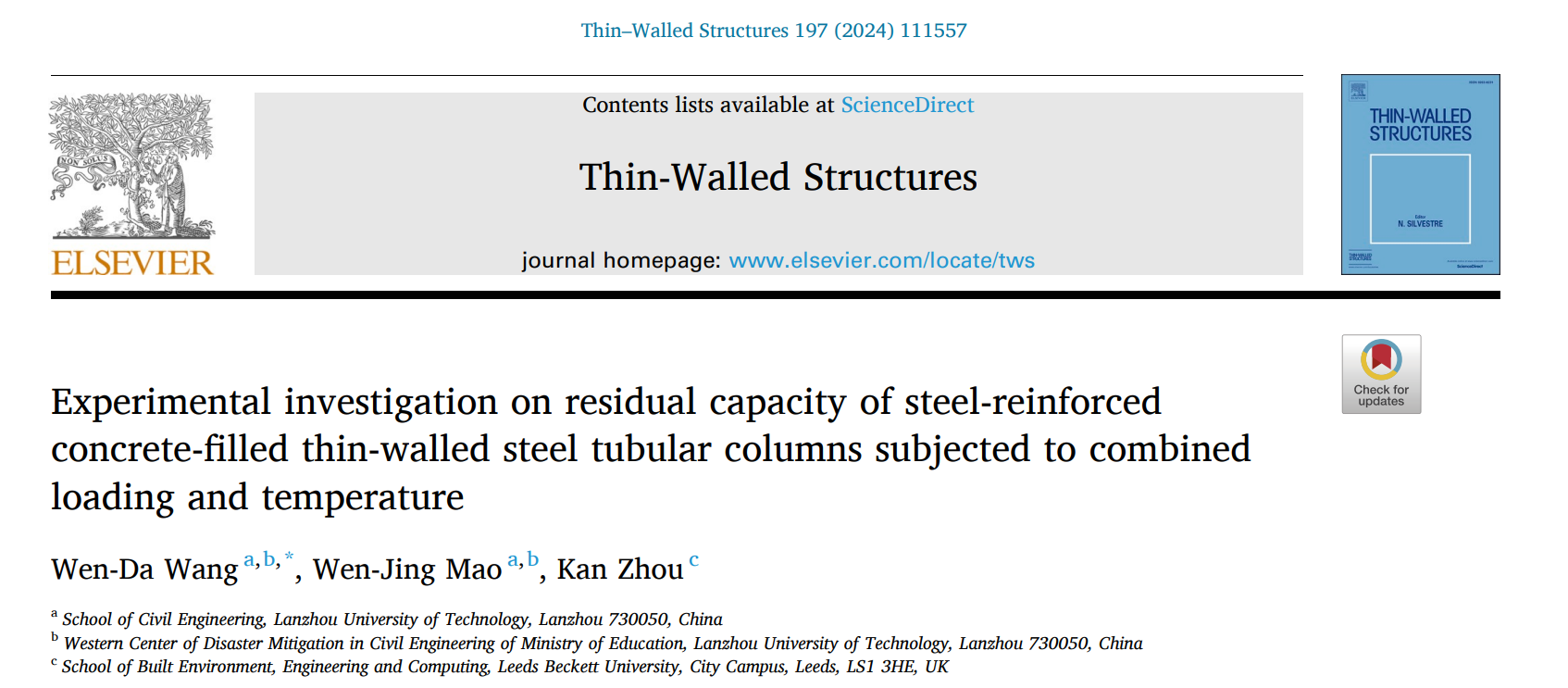 近日,金年会金字招牌诚信至上“钢与混凝土组合结构混合结构团队”在内配型钢的钢管混凝土组合结构抗火性能研究中取得一系列研究进展,并以题为“Experimental investigation on residual capacity of steel-reinforced concrete-filled thin-walled steel tubular columns subjected to combined loading and temperature”发表在工程技术领域Top期刊《Thin-Walled Structures》(中科院一区,IF: 6.4)。金年会金字招牌诚信至上“钢与混凝土组合结构混合结构团队”负责人王文达教授为第一作者,青年教师毛文婧博士为第二作者。金年会官方网站入口为第一署名单位,英国利兹贝克特大学为合作单位。