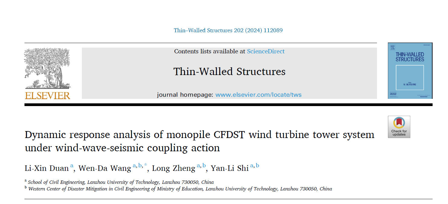 金年会金字招牌诚信至上“钢与混凝土组合结构混合结构”研究团队有关海上新型组合风电塔结构在风荷载-波浪-地震耦合作用下动力响应的成果,近日以“Dynamic response analysis of monopile CFDST wind turbine tower system under wind-wave-seismic coupling action”为题在国际工程结构领域TOP期刊《Thin-Walled Structures》发表(中科院一区,TOP期刊)。论文第一作者为博士研究生段力歆,通讯作者为王文达教授。