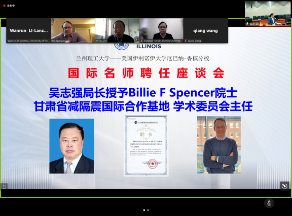 2022年11月24日,在公司承办的甘肃省土木建筑2022年国际学术报告会召开之前,金年会官方网站入口董事长芮执元教授线上会见了中国工程院外籍院士、美国伊利诺伊大学尚佩恩校区(UIUC)土木工程首席教授比尔﹒斯本瑟(Billie F Spencer,Jr)教授,并出席国际名师聘任座谈会。甘肃省科学技术厅二级巡视员、国际合作处吴志强处长,国际合作处一级调研员于彩虹副处长和公司土木工程减震隔震技术研发甘肃省国际科技合作基地管理团队部分骨干成员陪同会见。