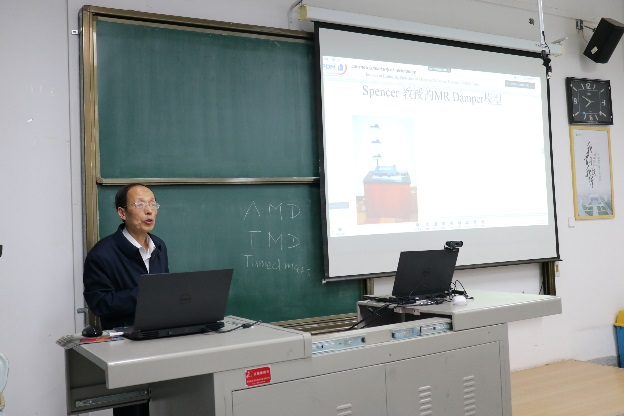 3月22日的前沿学术报告中,Spencer院士从结构控制原理、控制系统搭建、智能隔震技术及典型工程应用等方面,针对结构振动控制领域常见的磁流变阻尼器、金属阻尼器、调谐质量阻尼器(TMD)、主动质量阻尼器(AMD)、调频液体阻尼器(TLCD)的设计方法、控制原理、力学模型及在日本、欧洲和美洲等全球范围工程应用等做了详细介绍。会后,Spencer院士与参会师生进行了积极互动,围绕结构振动控制与智能材料发展的关键技术进行了讨论。