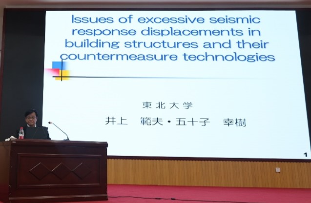 井上範夫教授和五十子幸树教授分别做了题为“How engineering practice benefits the scientific research in civil engineering (工程实践对土木工程科学研究的助成作用)”和“Issues of excessive seismic response displacements in building structures and their countermeasure technologies (建筑结构的大地震位移响应问题及其对策技术研究)”的学术报告。两个报告均从实际结构震害特点出发,结合自身工程经验阐述了以超高层建筑和隔震建筑为代表的低频结构地震控制难题,并结合低频结构基于位移控制的理念和惯容减震系统在低频结构地震控制中的工程应用系统展开。会后,井上範夫教授和五十子幸树教授与参会人员进行了积极互动,围绕结构减震和制振领域的关键技术问题开展了深入讨论。